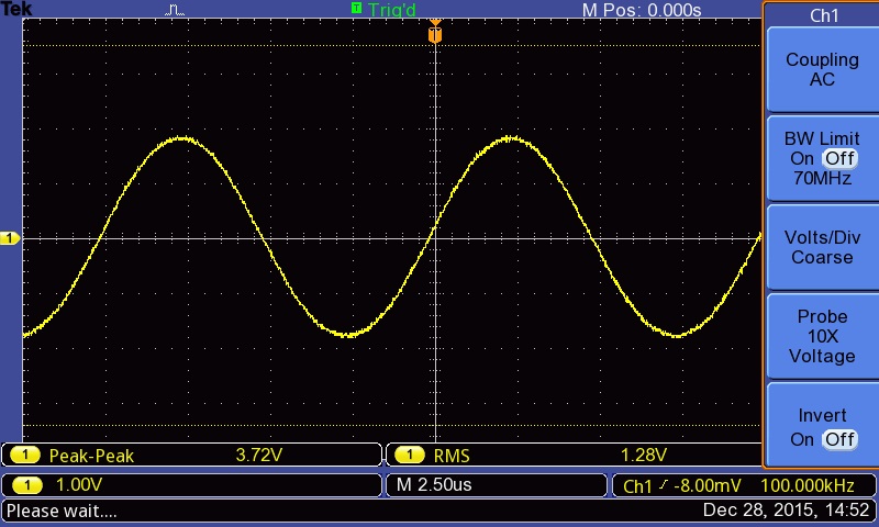 here are the oscilloscope waveforms of neat 100KHz, square, ramp and sine wave ( R_load 7.5ohms )